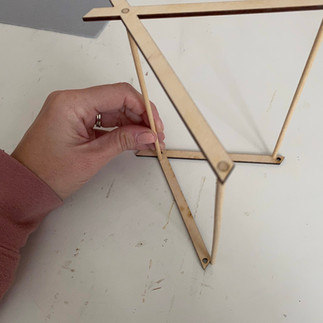 If you don't like the look of the burned wood (this happens on the laser cutter), you can start by sanding the 2 frame pieces (first photo). Personally, I think the tent looks good with the burned wood, but you do you. Lay out one of the frame pieces, and insert the 3 cross beams into the holes (second photo). It should be a snug fit but not too hard to insert. If you feel like it's too loose and you don't plan to take apart your tent, you can always use super glue or craft glue to hold everything in place. Lay out the other frame piece, and insert the cross beams into those holes to create frame of the tent (third photo).