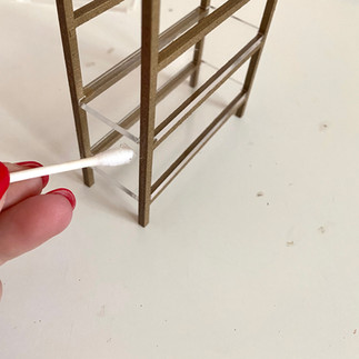 If you have too much glue residue, use a Q-tip to wipe off the excess (first picture). Try not to smear it on the shelves because the glue will leave a residue on the acrylic. Repeat this process for the third and fourth shelves. Allow the glue to dry completely before styling.